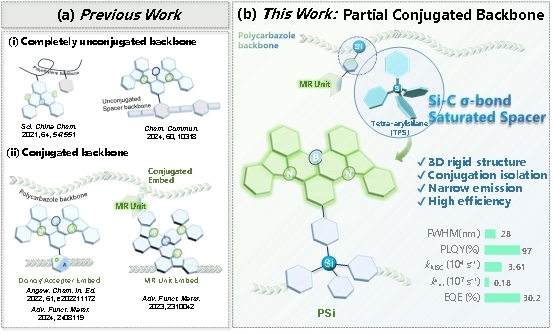 图1. (a) 已报道的窄带发射聚合物的设计策略;(b) 该工作的聚合物设计策略:基于嵌入硅-碳σ键饱和间隔基的部分共轭主链聚合物。