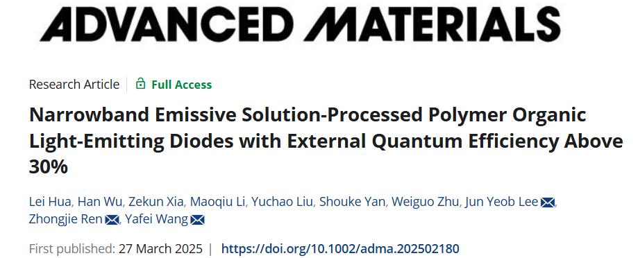 相关研究成果以题为《Narrowband Emissive Solution-Processed Polymer Organic Light-Emitting Diodes with External Quantum Efficiency Above 30%》发表于Advanced Materials,https://doi.org/10.1002/adma.202502180,常州大学华磊博士为第一作者,常州大学王亚飞教授、北京化工大学任忠杰教授及韩国成均馆大学Jun Yeob Lee教授为共同通讯作者。