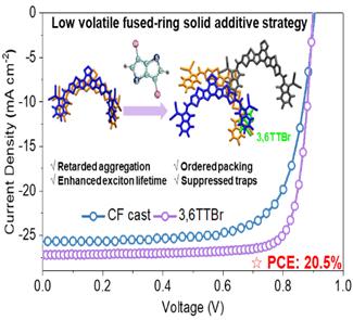 此外,宋欣教授等人在挥发性固体添加剂(VSA)提高有机太阳能电池(OSC)的功率转换效率(PCE)方面也取得重要进展。该团队针对高挥发性单环添加剂的作用机理已得到深入研究,而低挥发性稠环VSA对分子聚集和激子/载流子动力学的影响尚不清楚的问题,选择3,6-二溴噻吩并[3,2-b]噻吩(3,6TTBr)作为低挥发性稠环VSA的代表,以阐明其工作机制。研究发现,刚性平面的3,6TTBr分子吸附在L8-BO(受体)的末端单元上,诱导相邻分子产生松散空间。低挥发性的3,6TTBr有利于L8-BO的中心-末端堆积和较大的片段间距,从而缓解了L8-BO的过度聚集,诱导有序堆积。结果表明,3,6TTBr处理降低了L8-BO薄膜的聚集猝灭效应,提高了L8-BO薄膜的光致发光量子产率和激子寿命,同时降低了陷阱密度,改善了载流子输运性能,使光电转换效率达到20.1%。为了验证其普适性,该团队开展了另一种低挥发性稠环固体1,5-二溴萘(1,5-BN)的研究,使用1,5-BN的器件同样获得了20.5%的PCE,研究进一步阐明了低挥发性稠环VSA策略对提高OSC性能的有效性。